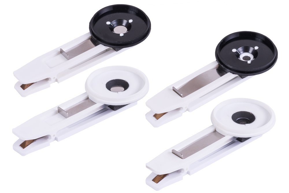 Clipes de folhas de adaptação escura são feitos de plástico, tornando-os pequenos e leves. O anel de localização (que se conecta ao sensor de fluorímetro) está posicionado sobre a área necessária da amostra e possui um orifício central de 4mm de diâmetro que é coberto por uma placa de obturador. Durante a medição, esse obturador desliza para trás para expor a amostra adaptada à escuridão aos LEDs focados e ao detector de fluorescência. Os clipes de folhas de PEA de bolso possuem um anel de localização preto, enquanto os clipes de folhas Handy PEA+ e M-PEA possuem um anel de localização branco com a parte inferior prateada, que reflete a luz incidente e minimiza o acúmulo de calor na amostra. Isso garante que a medição não seja afetada em condições de alta luz ambiente.