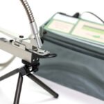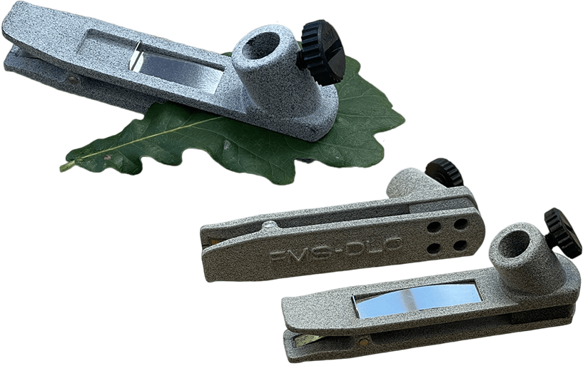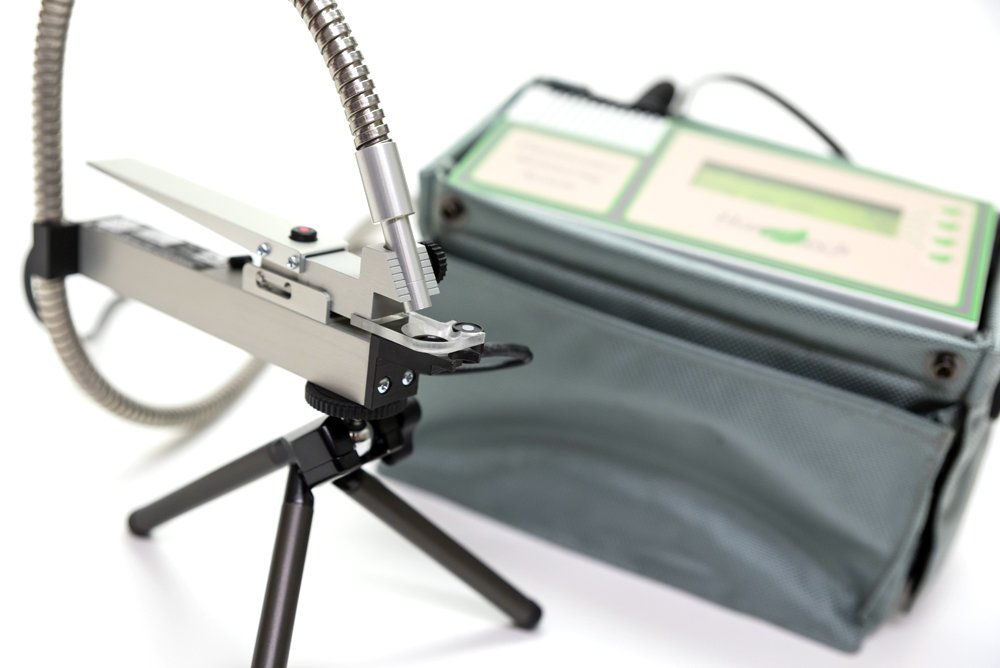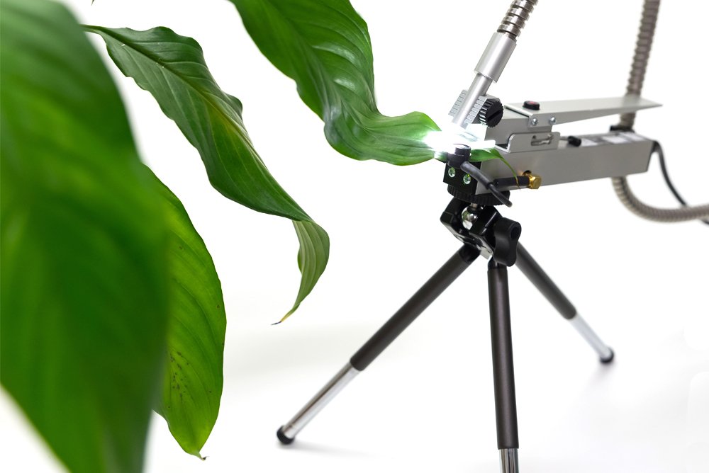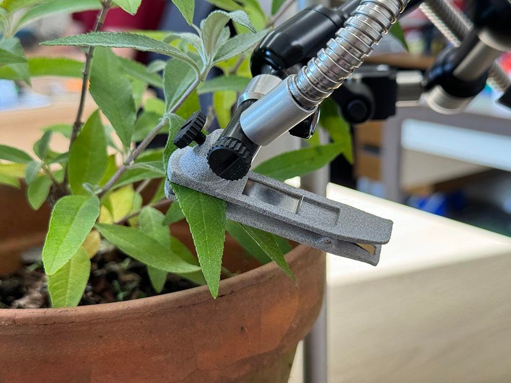Uma conexão elétrica ao soquete do clipe de folha no painel frontal do fluirômetro de clorofila FMS 2+ permite o uso do interruptor de gatilho remoto para ativar/abortar medições em modo local e conectar o termopar do clipe de folhas e o sensor de luz à unidade de controle. O clipe de folhas pode ser segurado na mão se várias amostras estiverem sendo estudadas ou montado em um tripé padrão por meio de uma rosca na seção inferior do clipe para trabalho em posição fixa.