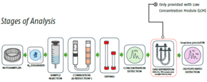 A medição de amostras com baixo teor de nitrogênio total (NT) sempre foi dificultada pela combinação de altas concentrações de gases dissolvidos (como o N₂) com a falta de um sistema de pré-concentração fácil de usar. Através da utilização do Módulo de Baixa Concentração (LCM), a Elementar inventou uma nova armadilha de N₂ que permite o foco do pico de N₂ sem a necessidade de um líquido criogênico. Juntamente com um desgaseificador exclusivo para remover os gases fisicamente dissolvidos da amostra e uma purificação otimizada do CO₂ e N₂ formados através de uma armadilha de halogênio com subsequente secagem intensiva de gás em 3 etapas, o iso TOC® cube garante um foco de pico superior tanto para CO₂ quanto para N₂ – um pré-requisito para o alto desempenho exigido em medições de espectrometria de massa de razão isotópica (IRMS).