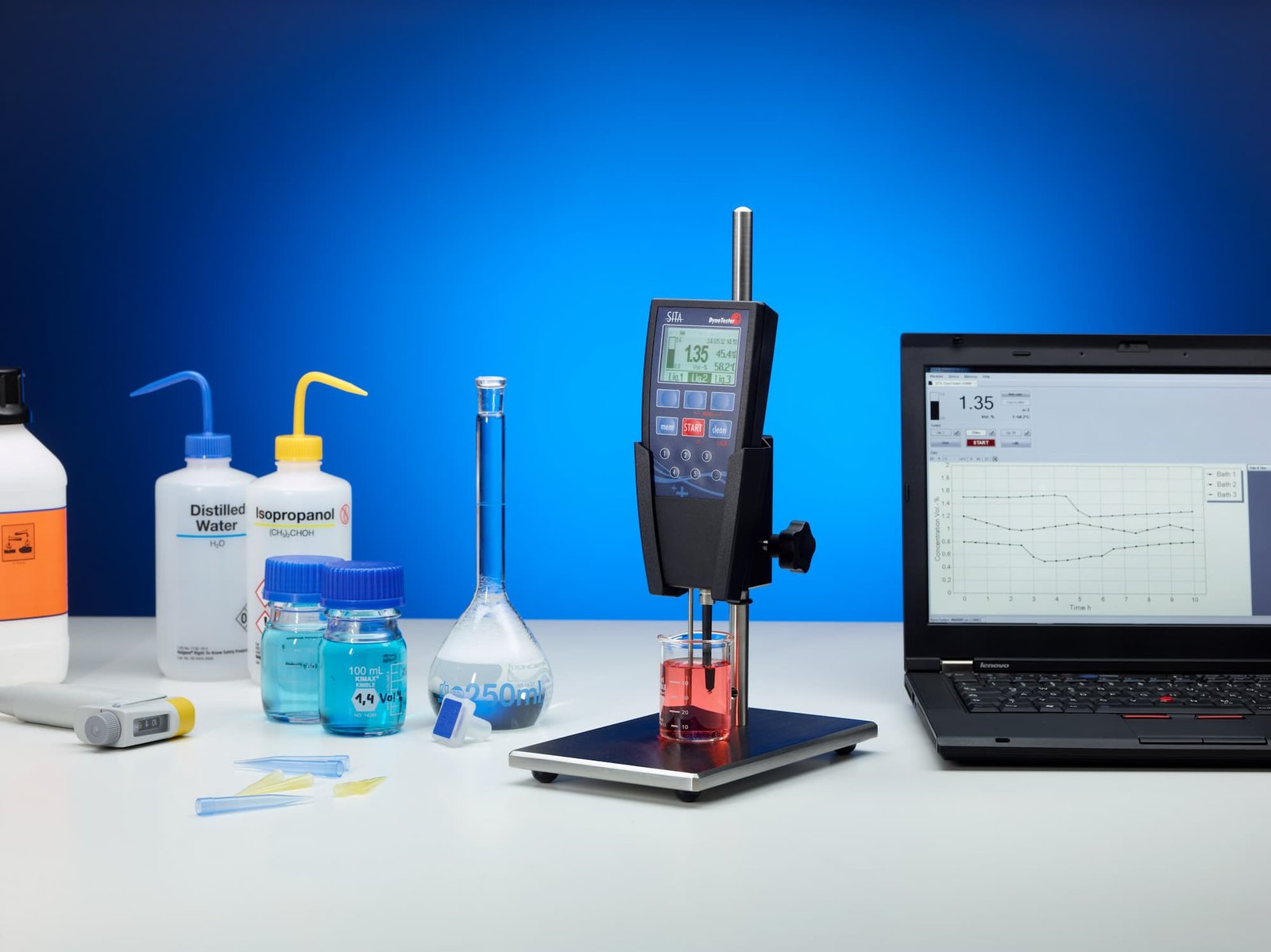 O Tensiômetro portátil de bolha mede a tensão superficial e a concentração de surfactante de forma fácil e rápida, tanto em laboratório quanto na linha de produção, o equipamento exibe os valores medidos diretamente em um visor intuitivo ou no computador e emite alertas caso os limites definidos sejam excedidos ou não atingidos, permitindo o monitoramento do processo e o controle de qualidade.